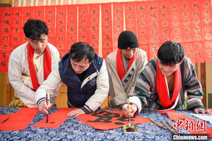 寫春聯(lián)、掛燈籠、做湯圓……在綿綿的藏歌聲中,留校西藏學(xué)生向陪伴他們連續(xù)度過了兩年春節(jié)的“代表媽媽”們敬獻(xiàn)了潔白哈達(dá),而“代表媽媽”則為她們的“西藏孩子”們圍上了紅色圍巾,互相傳遞著美好祝愿。
