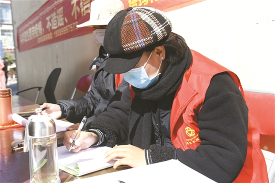 為大學(xué)生志愿者次仁措姆在塔瑪小區(qū)門口幫小區(qū)物業(yè)登記出入人員信息。(本組圖片由拉薩融媒視覺(jué)組攝)