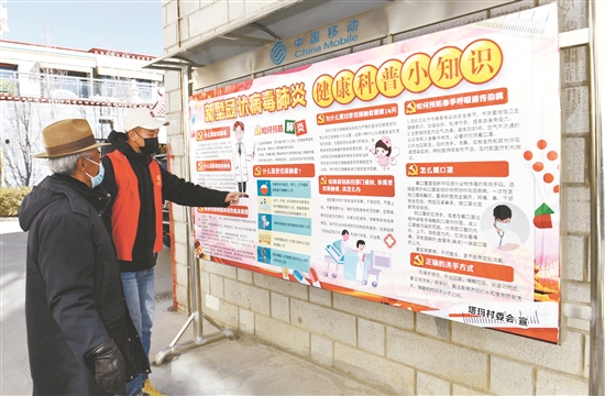 為大學(xué)生志愿者扎西平措在塔瑪小區(qū)內(nèi)的宣傳欄前給路過(guò)的居民普及防控知識(shí)。。(本組圖片由拉薩融媒視覺(jué)組攝)