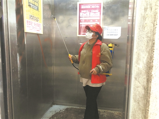 為大學(xué)生志愿者拉姆在城關(guān)花園A區(qū)電梯內(nèi)噴灑消毒液。(本組圖片由拉薩融媒視覺(jué)組攝)