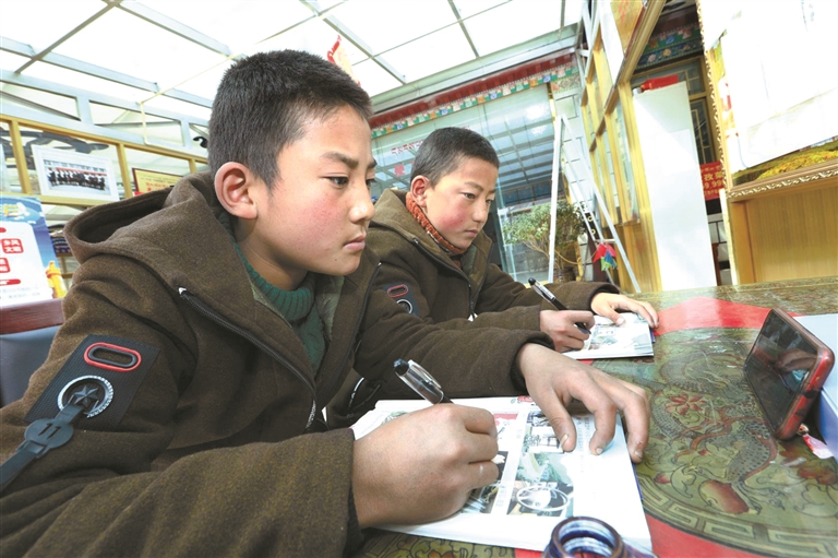 為在西藏拉薩市墨竹工卡縣甲瑪鄉(xiāng)孜孜榮村兩名中學生通過釘釘軟件上網(wǎng)課。由墨竹工卡縣委宣傳部洛克攝