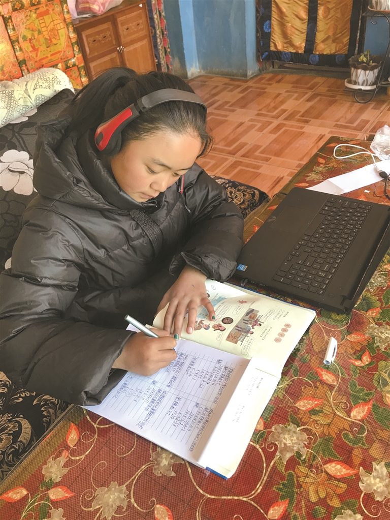 為西藏拉薩市曲水縣聶當鄉(xiāng)小學五年級二班學生旦增拉姆在家上網(wǎng)課。圖片由曲水縣委宣傳部拉姆攝