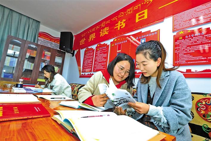 拉薩市墨竹工卡縣教育局干部職工在黨員活動室內閱讀圖書。洛克 記者 唐斌 攝