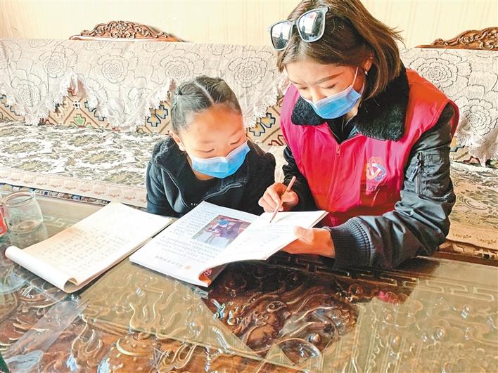 西藏那曲索縣“四講四愛”宣講團(tuán)成員在進(jìn)行入戶宣講的同時(shí),積極開展送教活動(dòng)。圖為索縣廣電中心副主任科員兼“四講四愛”辦工作人員次仁德吉入戶為學(xué)生輔導(dǎo)課后作業(yè)。記者 萬靖 張宇 攝