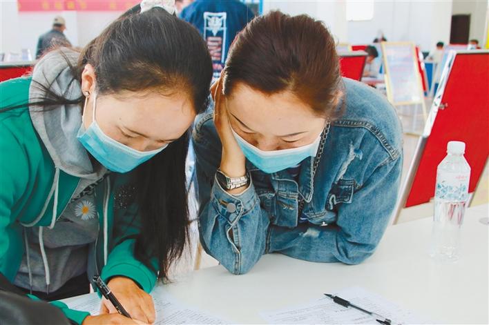 圖為應(yīng)聘者在填寫報(bào)名表。記者 段敏 攝
