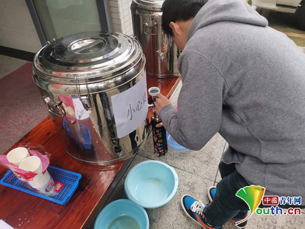 圖為學(xué)生正在飲用“大鍋湯”。中國(guó)青年網(wǎng)通訊員 沈萌萍 攝