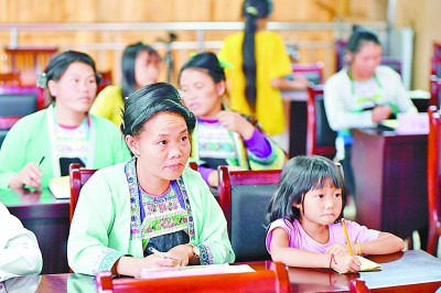 9月12日,在桂黔交界的大苗山深處,代時英和女兒在烏英苗寨“雙語雙向”培訓班聽課。新華社發(fā)