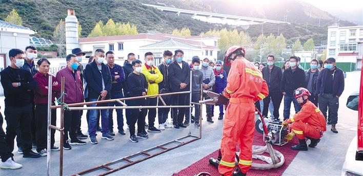 圖為工布江達(dá)縣消防救援大隊(duì)指戰(zhàn)員在為密集場(chǎng)所從業(yè)人員進(jìn)行消防器材操作示范。姜偉 攝