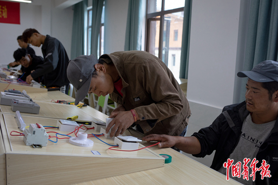 29歲的扎西才登(右二)在電工教室練習線路組裝。李雋輝/攝