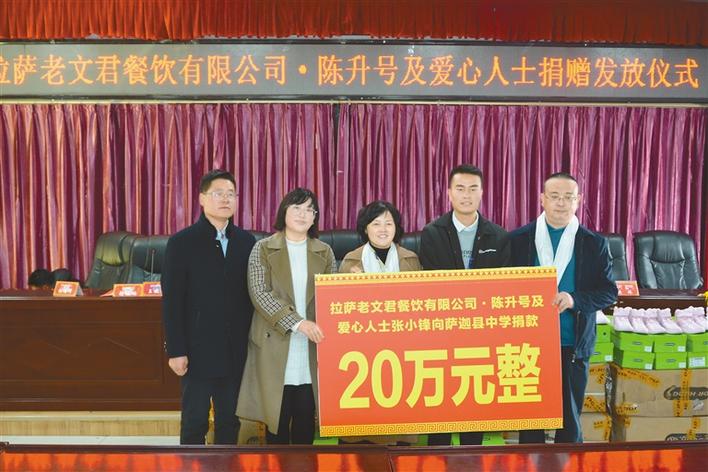 10月28日,拉薩老文君餐飲有限公司·陳升號(hào)及相關(guān)愛心人士向西藏日喀則薩迦縣中學(xué)捐贈(zèng)405雙價(jià)值68445元的運(yùn)動(dòng)鞋,并達(dá)成20萬(wàn)元捐款意向,用于薩迦中學(xué)教育發(fā)展。