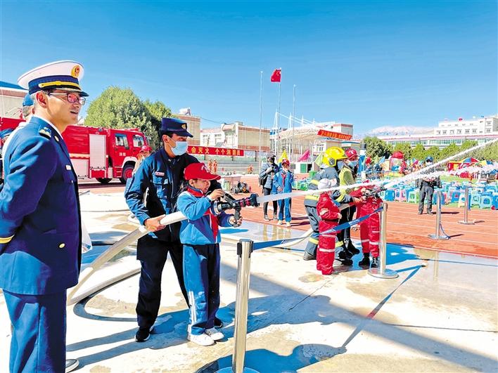 圖為山南市消防救援支隊(duì)工作人員引導(dǎo)小朋友們體驗(yàn)消防器材的使用。郎永庫 攝