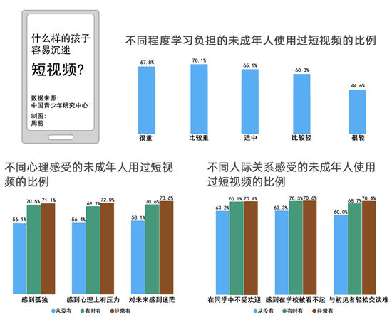 調(diào)查同時(shí)發(fā)現(xiàn),感到孤獨(dú)、心理上有壓力、對(duì)未來(lái)迷惘的中小學(xué)生接觸短視頻的比例更高。