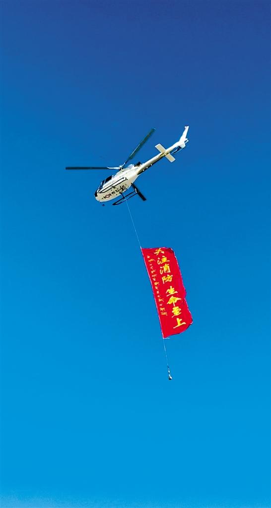 直升機(jī)攜帶”關(guān)注消防 生命至上“的標(biāo)語(yǔ)開(kāi)展空中宣傳。