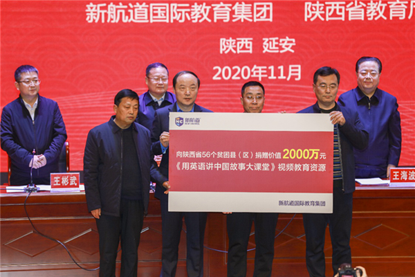 11月9日,陜西省教育廳與新航道國(guó)際教育集團(tuán)教育精準(zhǔn)扶貧合作儀式在陜西省宜川縣舉行。新航道國(guó)際教育集團(tuán)將為陜西省56個(gè)貧困縣(區(qū))的中小學(xué)英語(yǔ)教師贈(zèng)送價(jià)值2000萬(wàn)元的英語(yǔ)教育創(chuàng)新成果——《用英語(yǔ)講中國(guó)故事大課堂》視頻課程,運(yùn)用先進(jìn)的人工智能技術(shù)幫助貧困地區(qū)英語(yǔ)教師突破地域和空間的限制獲得更優(yōu)質(zhì)的教育資源,為英語(yǔ)教學(xué)帶來(lái)全新的視野和豐富的素材。
