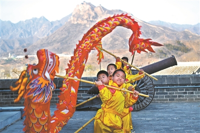北京市密云區(qū)古北口鎮(zhèn)中心小學(xué)結(jié)合戍邊文化、地域文化,成立“舞龍”社團(tuán)。喜愛傳統(tǒng)舞龍文化的學(xué)生登上長城,舞出“堅毅”精神,舞出時代風(fēng)采,舞出民族自豪。樊世剛 攝