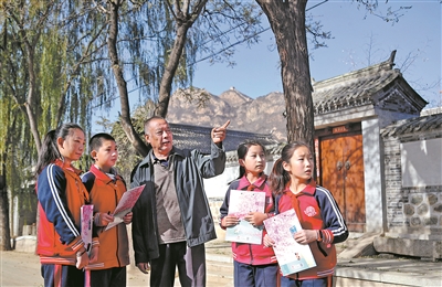 長城腳下美麗的河西村為什么會有137個姓氏?走在村中古樸的小路上,聆聽老支書張玉山的講述,古北口鎮(zhèn)中心小學(xué)學(xué)生探尋河西村多民族、多姓氏融合的“百姓村”成因。樊世剛 攝