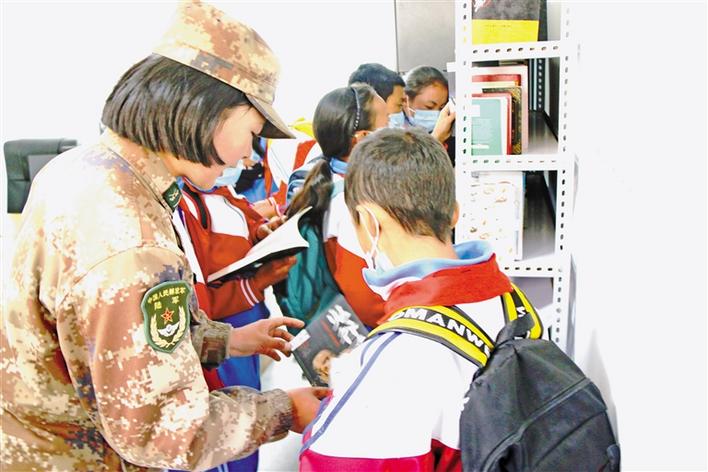 圖為部隊(duì)官兵在向?qū)W生介紹部隊(duì)圖書室藏書情況。段敏 攝
