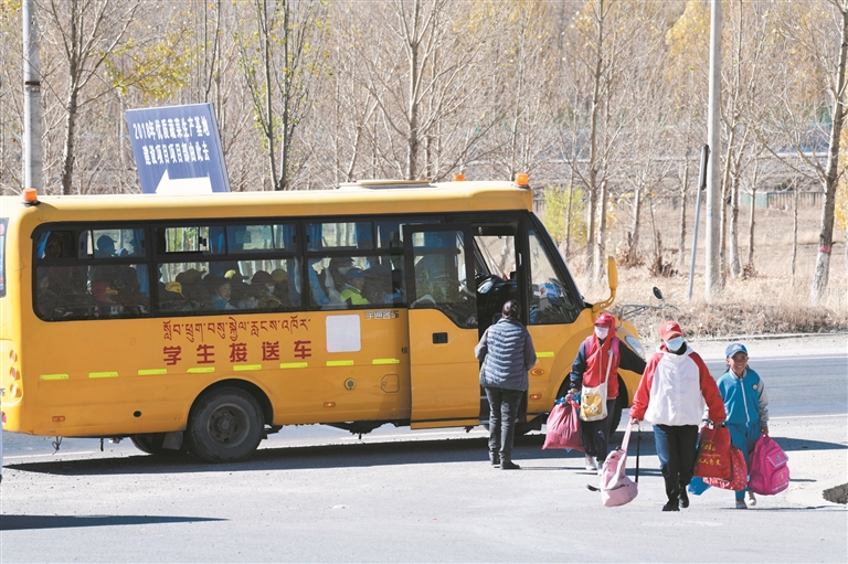 圖為在堆龍德慶區(qū)古榮鎮(zhèn)生態(tài)搬遷點,學(xué)生走下校車。貢嘎來松攝