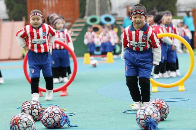 12月7日,淮北市第二實驗幼兒園的小朋友在足球課上參加足球游戲。