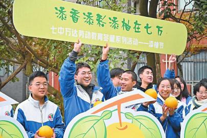 12月4日,成都七中萬達(dá)學(xué)校首屆“添柚節(jié)”開幕?!疤龛止?jié)”覆蓋了多個(gè)年級,設(shè)置了多項(xiàng)活動(dòng),并融入學(xué)科元素,如初一年級結(jié)合生物和美術(shù)學(xué)科,或用柚子做小零食進(jìn)行義賣,或在柚子上繪出不同的圖案;初二年級則結(jié)合地理和美術(shù)學(xué)科,描繪出一幅幅中國的“水果”地圖;高三年級的學(xué)生摘下柚子與老師一同品嘗豐收的味道。