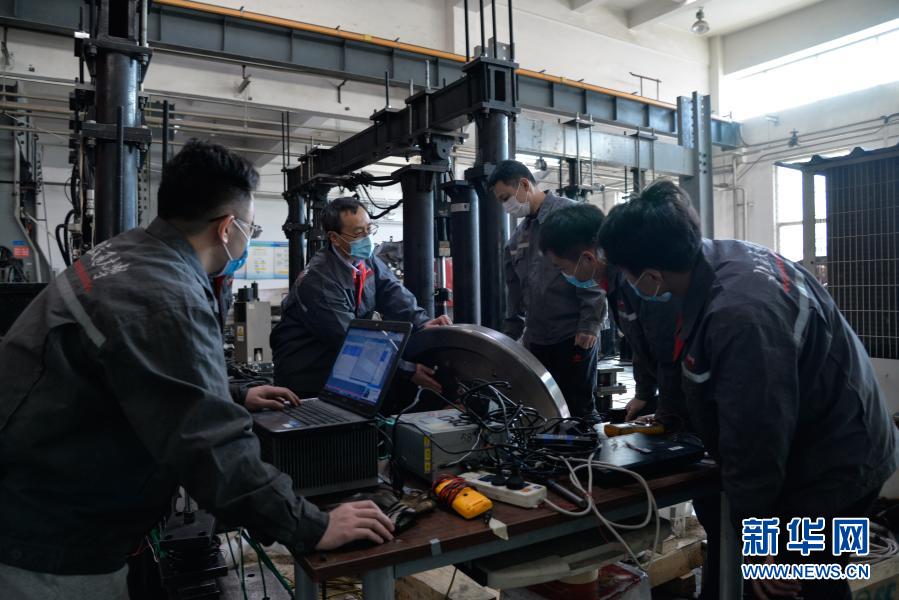 2月9日,北京交通大學(xué)教師和學(xué)生在結(jié)構(gòu)強(qiáng)度檢測實驗室一起研討高速列車輪軸結(jié)構(gòu)可靠性。新華社記者 徐欽 攝