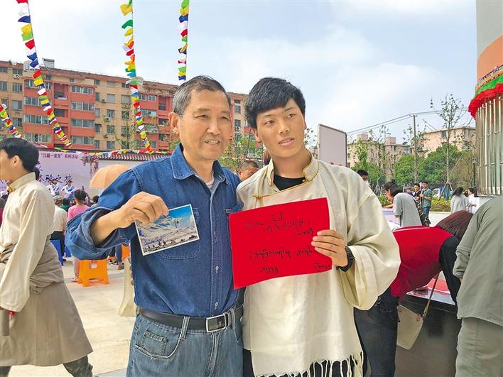 圖為江蘇省南通中學(xué)藏文化社團(tuán)在南通市北濠社區(qū)開展藏文化宣傳與展示活動(dòng)時(shí),藏族學(xué)生把藏文書寫的明信片贈(zèng)送給當(dāng)?shù)厥忻瘛?圖片由江蘇省南通中學(xué)提供
