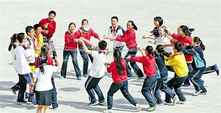 圖為西安市浐灞第一中學(xué)陜、藏學(xué)子們共同托起“同心鼓”。 圖片由西安市浐灞第一中學(xué)提供
