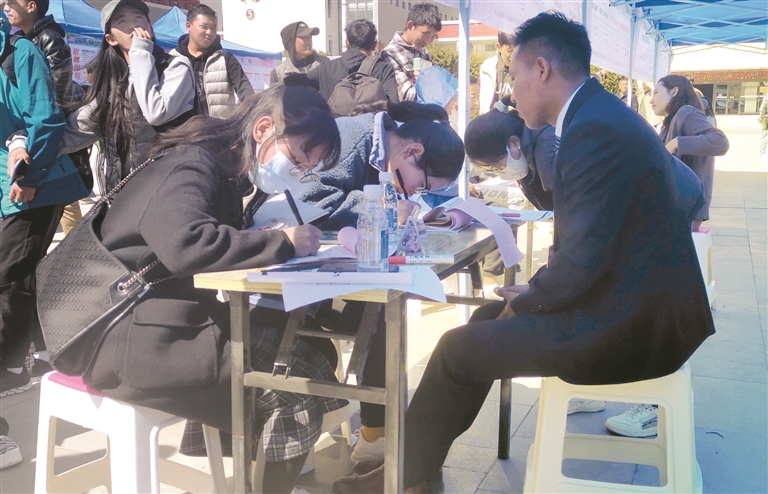 拉巴占堆是西藏大學(xué)藏語言文學(xué)師范專業(yè)的一名大四畢業(yè)生,他曾在拉薩北京實(shí)驗(yàn)中學(xué)實(shí)習(xí)過,對教育工作充滿熱情。招聘會現(xiàn)場,他向卓夢培訓(xùn)等教育相關(guān)企業(yè)都投遞了簡歷?!拔彝读藥追莺啔v了,希望能夠找到和自己專業(yè)相關(guān)的工作,實(shí)現(xiàn)自己的價(jià)值?!崩驼级颜f。
