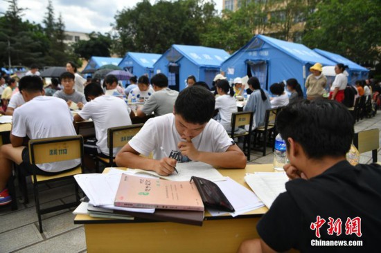 5月22日,云南省大理州漾濞縣漾濞一中的高三學(xué)生在露天“教室”備戰(zhàn)高考。5月21日,當(dāng)?shù)剡B發(fā)多次地震,最高6.4級(jí)。 中新社記者 劉冉陽 攝
