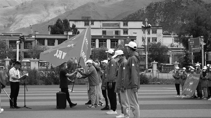 共青團(tuán)西藏自治區(qū)委員會副書記何華向各市地志愿者隊伍授旗。圖由團(tuán)區(qū)委提供