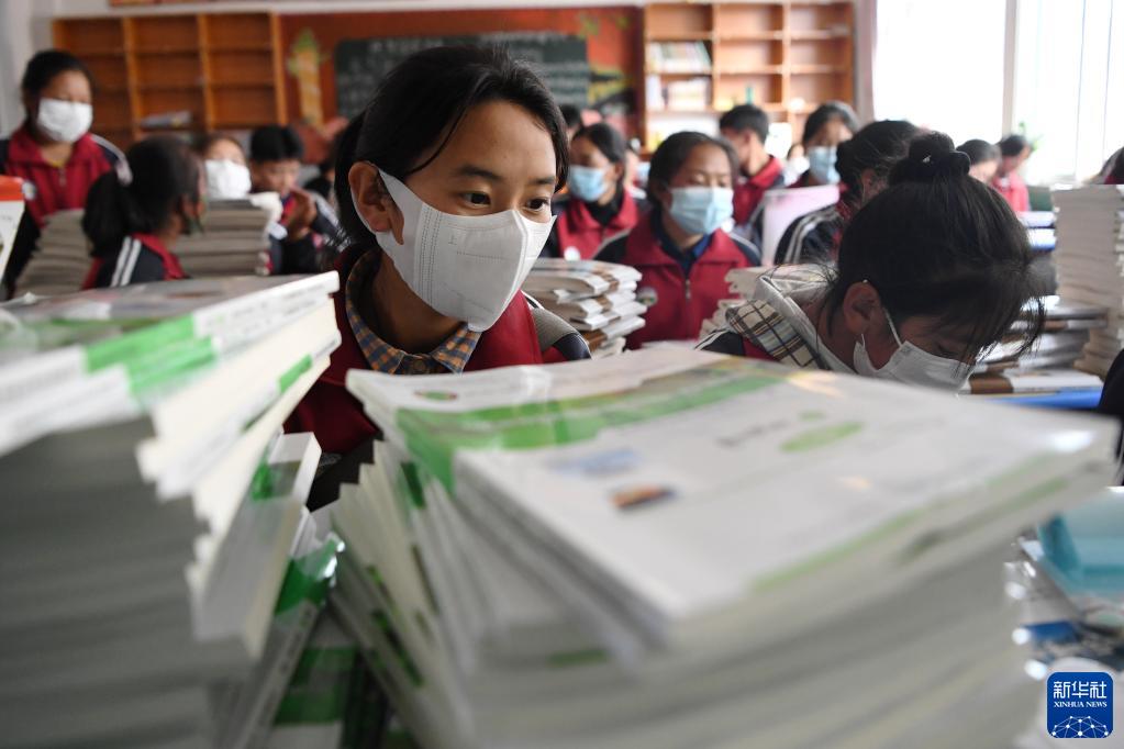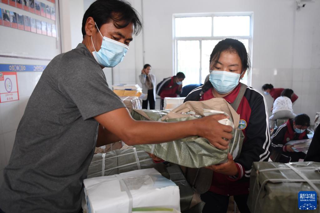 碌曲縣藏族中學(xué)的老師給學(xué)生分發(fā)新學(xué)期教材(8月30日攝)。新華社記者 杜哲宇 攝