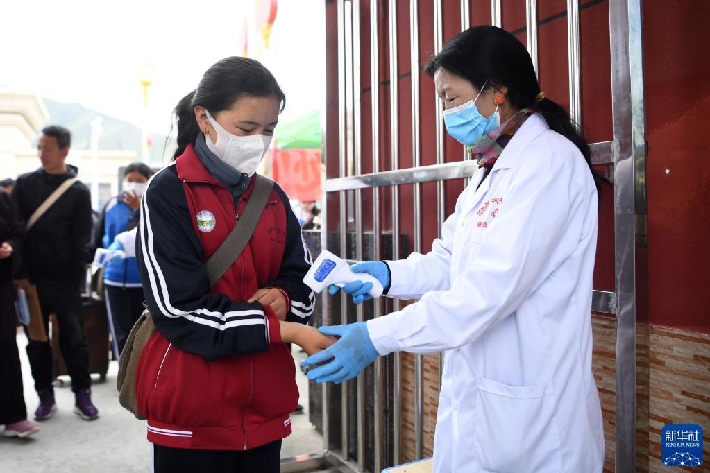 碌曲縣藏族中學(xué)學(xué)生進(jìn)入校園時(shí)測(cè)量體溫(8月30日攝)。新華社記者 杜哲宇 攝