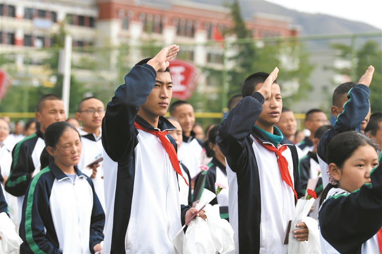 拉薩市第一小學的孩子身著節(jié)日盛裝,向老師敬獻鮮花。