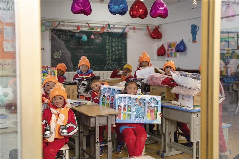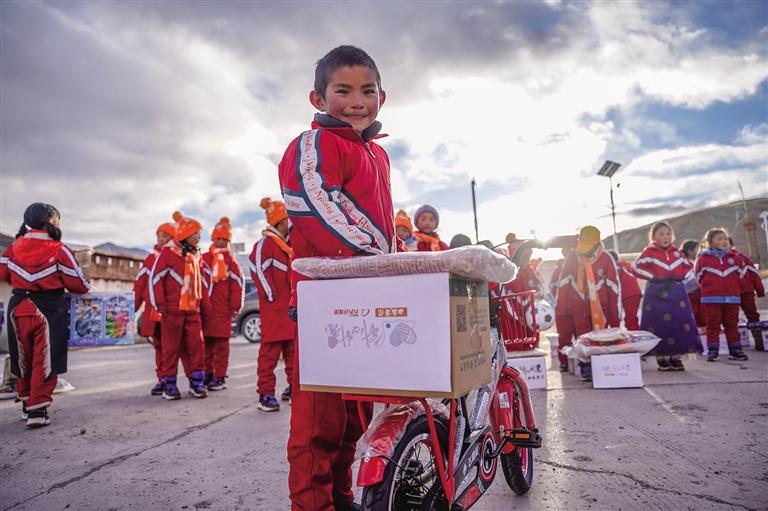 足球、籃球、奧特曼玩具、芭比娃娃、遙控飛機、自行車……孩子們欣喜地接過心心念念的禮物,迫不及待地玩耍起來,紅彤彤的臉上流露出純真的笑容。