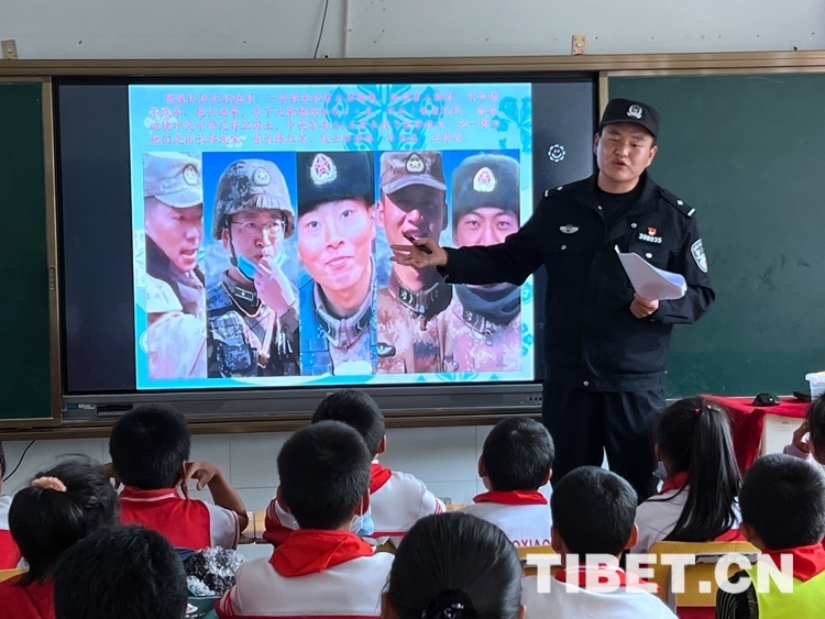 中國西藏網(wǎng)訊 “同學(xué)們,大家知道照片上這位英雄是誰嗎?”伴隨著民警周升展的提問聲,孩子們紛紛舉起手回答出了這位英雄——祁團(tuán)長。“你們真聰明,今天叔叔給大家講一講新時(shí)代衛(wèi)國戍邊英雄祁發(fā)寶團(tuán)長的故事……”