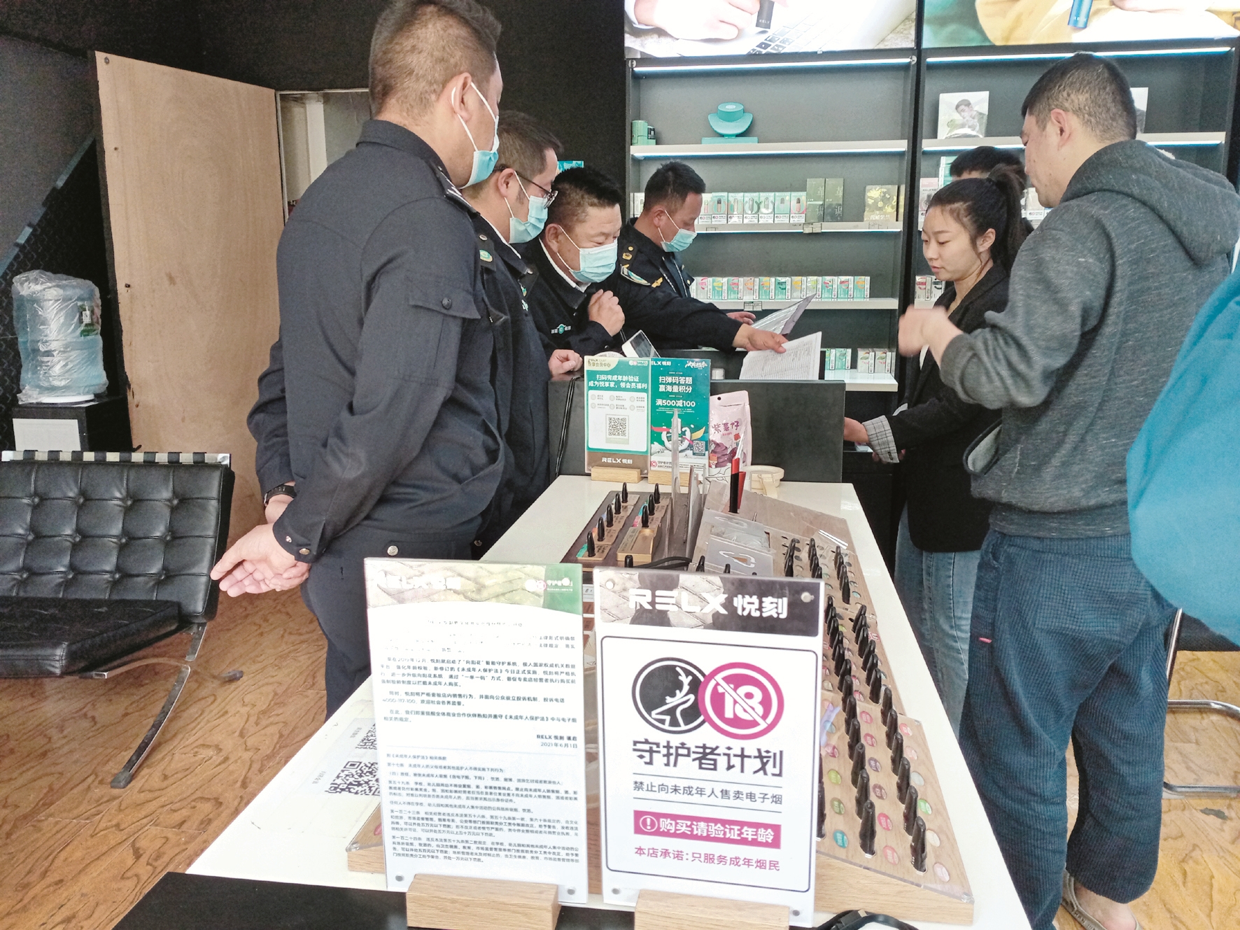 4月25日上午,市公安局和市煙草專賣局等四部門工作人員在柳梧新區(qū)聯(lián)合開展了電子煙銷售網(wǎng)點(diǎn)檢查。每到一個電子煙銷售網(wǎng)點(diǎn),執(zhí)法人員會詳細(xì)查看銷售網(wǎng)點(diǎn)是否具有相關(guān)經(jīng)營資質(zhì)、是否設(shè)立不得向未成年人售賣電子煙警示標(biāo)志以及身份證件核驗(yàn)等規(guī)定落實(shí)情況,并向電子煙經(jīng)營者進(jìn)行相關(guān)法律法規(guī)宣傳,告知經(jīng)營者嚴(yán)禁向未成年人銷售電子煙。
