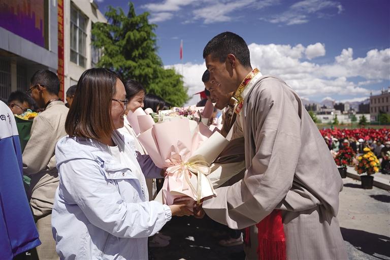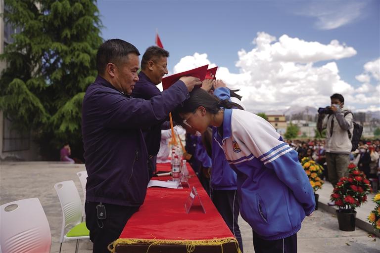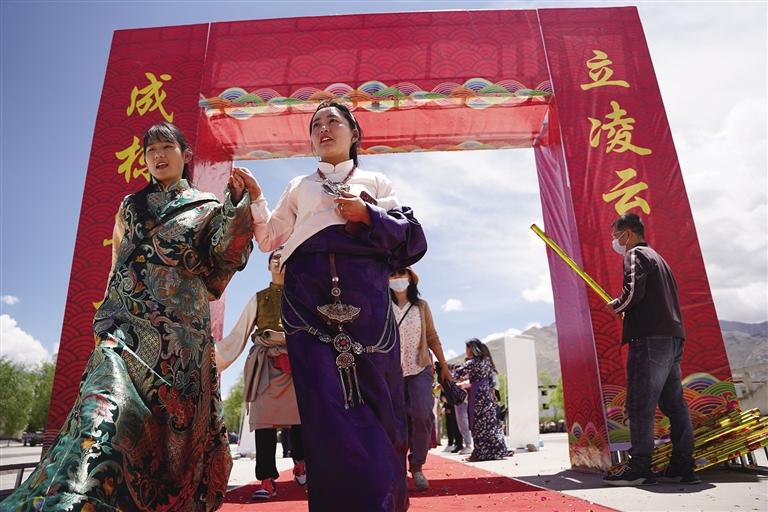 走進拉薩市第四高級中學,校園里每個角落都流露出喜悅與溫馨,同學們身著色彩鮮艷的民族傳統(tǒng)服裝,帶著自信的笑容,在父母與老師的陪伴下,走過“成人門”,踏上“成才路”,通向“成功門”。此時的他們意氣風發(fā),青春的面龐如同朝陽一般閃爍著光芒,滿懷豪情地憧憬精彩的人生。高三學生朗色占堆告訴記者:“今天是特別值得紀念的日子,以后我們都是成年人了,會勇于承擔責任,對自己的行為負責,努力成為一個有知識、知感恩、有責任、有擔當?shù)男聲r代新青年。”