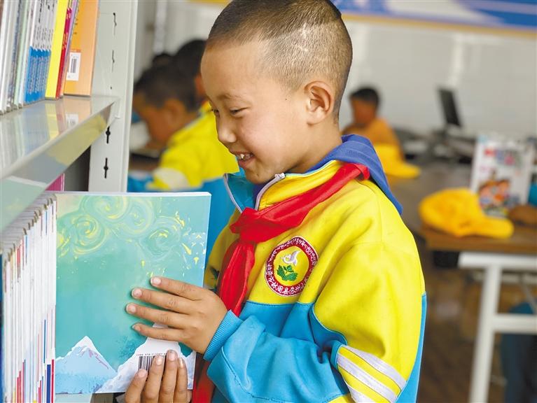 在蘇州援建的蘇萱圖書(shū)室內(nèi),林周縣蘇州小學(xué)學(xué)生正在挑選自己喜歡的讀物。