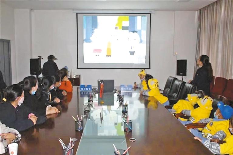 圖為色尼區(qū)人民檢察院通過多媒體法律講堂向幼兒和家長代表播放《中華人民共和國家庭教育促進法》。記者 萬靖 攝