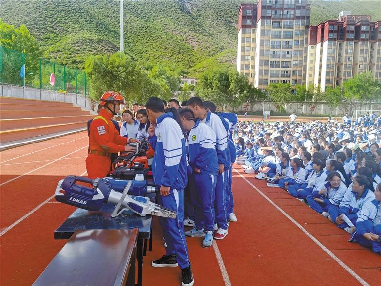 圖為昌都市卡若區(qū)森林消防中隊(duì)消防救援人員向?qū)W生展示救援裝備。記者 桑鄧旺姆 通訊員 張強(qiáng) 攝
