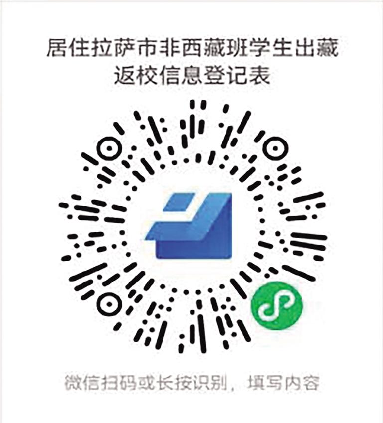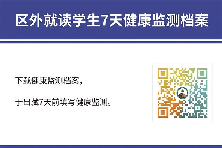 根據(jù)拉薩市委、市政府和自治區(qū)教育廳部署安排,為準(zhǔn)確掌握學(xué)生出藏行程規(guī)劃,為民航、鐵路等交通部門(mén)調(diào)配運(yùn)力提供參考依據(jù),拉薩市教育局需精準(zhǔn)掌握居住在拉薩市的區(qū)外就讀西藏籍大學(xué)生、區(qū)外非西藏班就讀西藏干部職工子女、區(qū)外就讀進(jìn)城務(wù)工人員子女、旅居區(qū)內(nèi)的區(qū)外學(xué)生出藏相關(guān)信息,請(qǐng)廣大家長(zhǎng)、學(xué)生積極配合,掃描以下二維碼,填報(bào)出行信息;下載健康監(jiān)測(cè)檔案,于出藏7天前填寫(xiě)健康監(jiān)測(cè)。