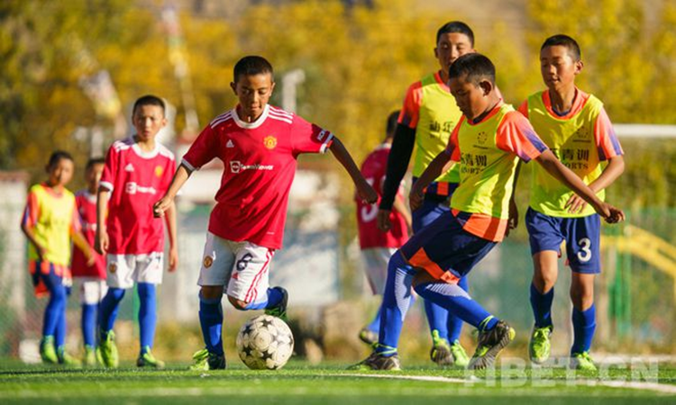 圖為2021年全國(guó)青少年體育冬夏令營(yíng)進(jìn)校園活動(dòng)(西藏站)閉營(yíng)儀式上,學(xué)生們正在進(jìn)行足球比賽 攝影:趙耀