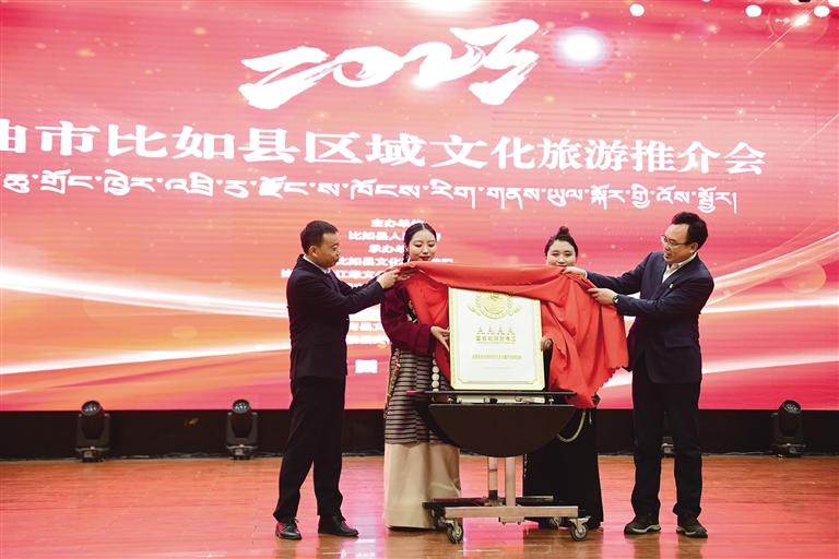 隨后,比如縣、索縣、巴青縣、嘉黎縣代表依次通過文旅資源推介向大家展現(xiàn)了不同縣區(qū)別樣的自然風(fēng)光與人文風(fēng)采。同時(shí),現(xiàn)場(chǎng)還舉辦了比如唐蕃古道文化旅游景區(qū)國家AAAA級(jí)旅游景區(qū)揭牌儀式。