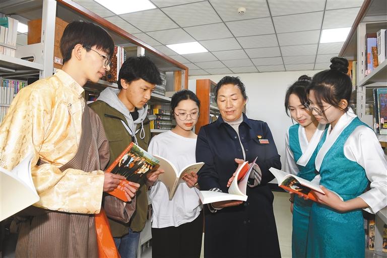 圖為在西藏大學(xué)圖書(shū)館,央宗老師和學(xué)生分享《習(xí)近平與大學(xué)生朋友們》一書(shū)。記者 李洲 攝
