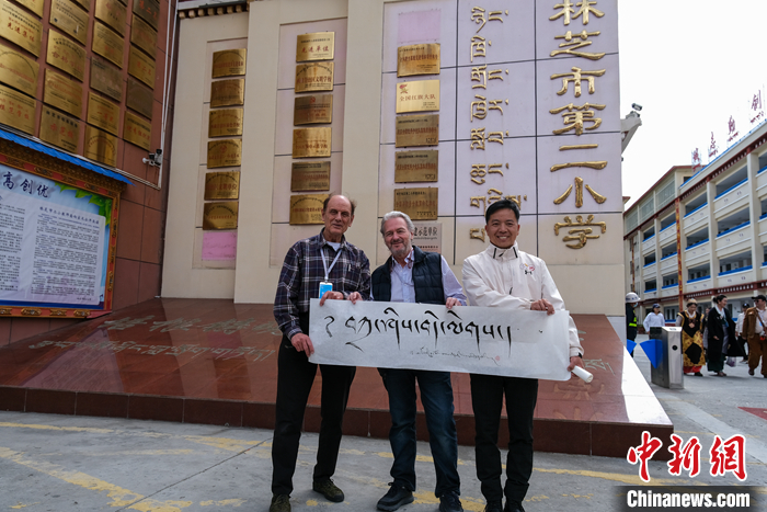 圖為5月18日,柯馬凱(左一)在林芝市第二小學(xué)參訪時(shí)獲得學(xué)校贈(zèng)予的藏文書法作品“扎西德勒”。 中新社記者 江飛波 攝