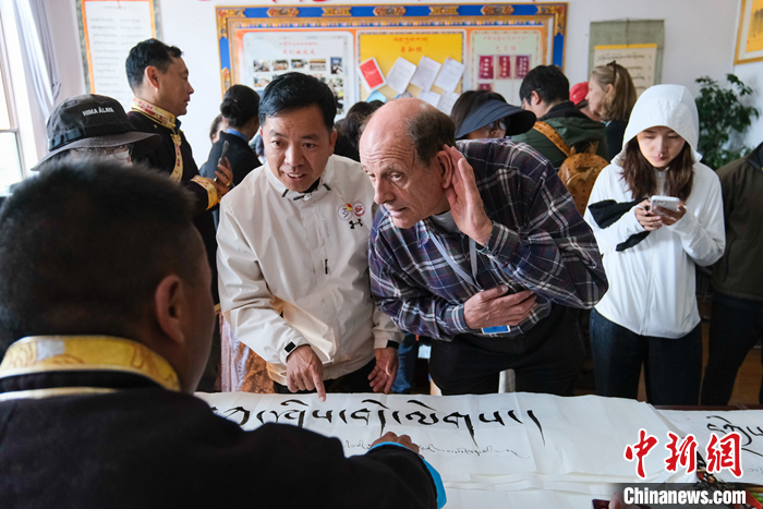 圖為5月18日上午,參訪團(tuán)成員柯馬凱(Michael Crook)側(cè)耳傾聽藏文書法老師的講解。 中新社記者 江飛波 攝
