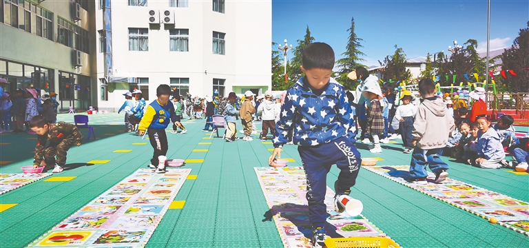 西藏軍區(qū)機關(guān)幼兒園兒童在做游戲——“紙杯運小球”。通訊員 白曲 攝