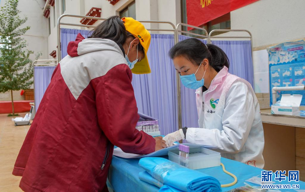 7月4日,耿直醫(yī)生在給那曲市色尼區(qū)尼瑪鄉(xiāng)小學學生做心臟聽診。(新華社記者 邵澤東 攝)