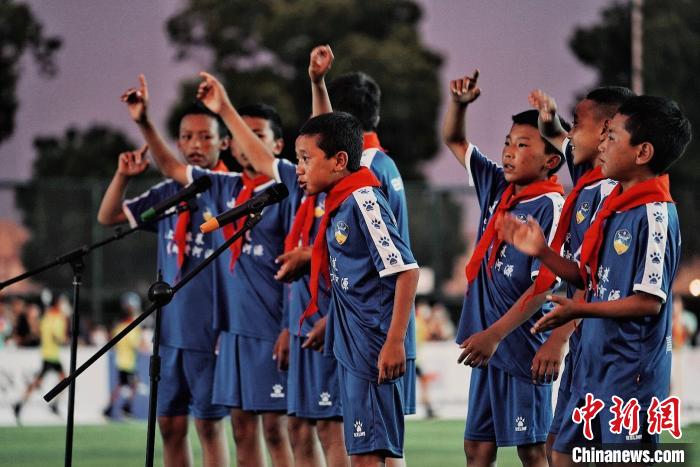 圖為足球小將們賽場(chǎng)上合唱藏語(yǔ)歌曲《FLY》。曲麻萊縣委宣傳部供圖