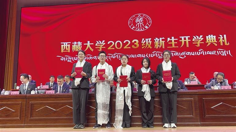 開學典禮上表彰了2022年度榮獲“三好學生”榮譽稱號以及榮獲“國家獎學金”“優(yōu)秀學生獎學金”“特殊嘉獎”的學生。隨后,學校領導為新生代表佩戴了西藏大學校徽。